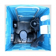 Caixa de dejetos com assento, porta papel higiênico, piso antiderrapante em polietileno, identificação (masculino/feminino), lavatório, acionamento de água no pé, porta saboneteira liquida, porta papel toalha, espelho, descarga na caixa de dejetos com acionamento no pé, ponto de ventilação natural, mictório, teto translúcido, fechadura de metal com sinalizador.